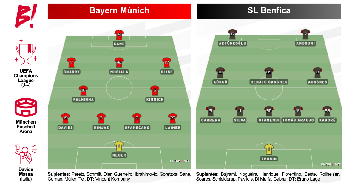 Las mayores sorpresas vienen de parte del equipo de Benfica, que usualmente juega con un esquema de 4 defensas, tres medios y tres delanteros y ahora se muestra más timorato ante el Bayern Múnich, dejando en la banca al campeón del mundo y figura de Argentina en Catar 2022, Ángel Di María.